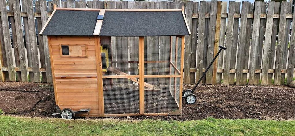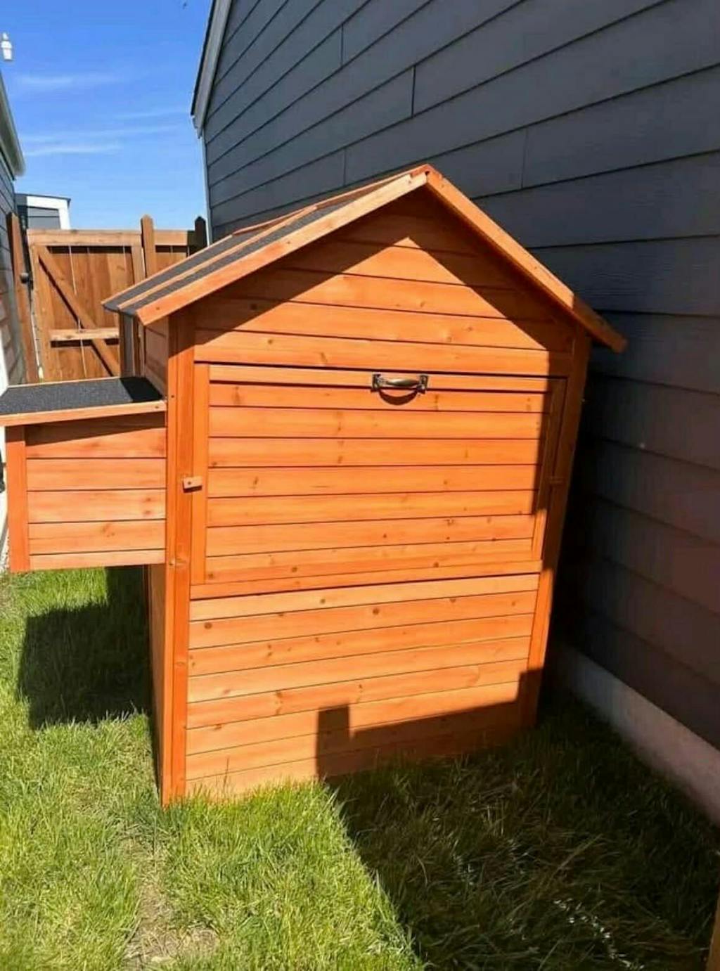 Coop features a large double nesting box and a lid for easy egg retrieval.